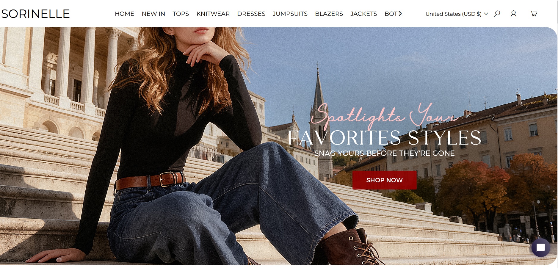 Sorinelle.com presents itself as an online fashion store that mainly focuses on women’s clothing. When you land on the website, it gives a modern boutique-style vibe, showcasing trendy outfits such as dresses, tops, knitwear, jackets, and casual wear.